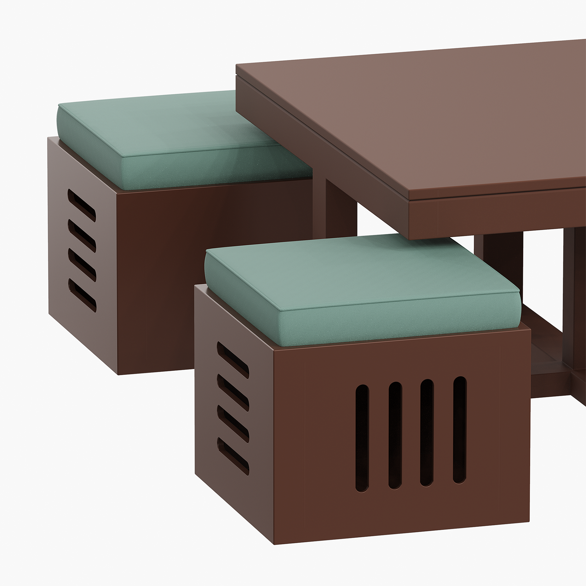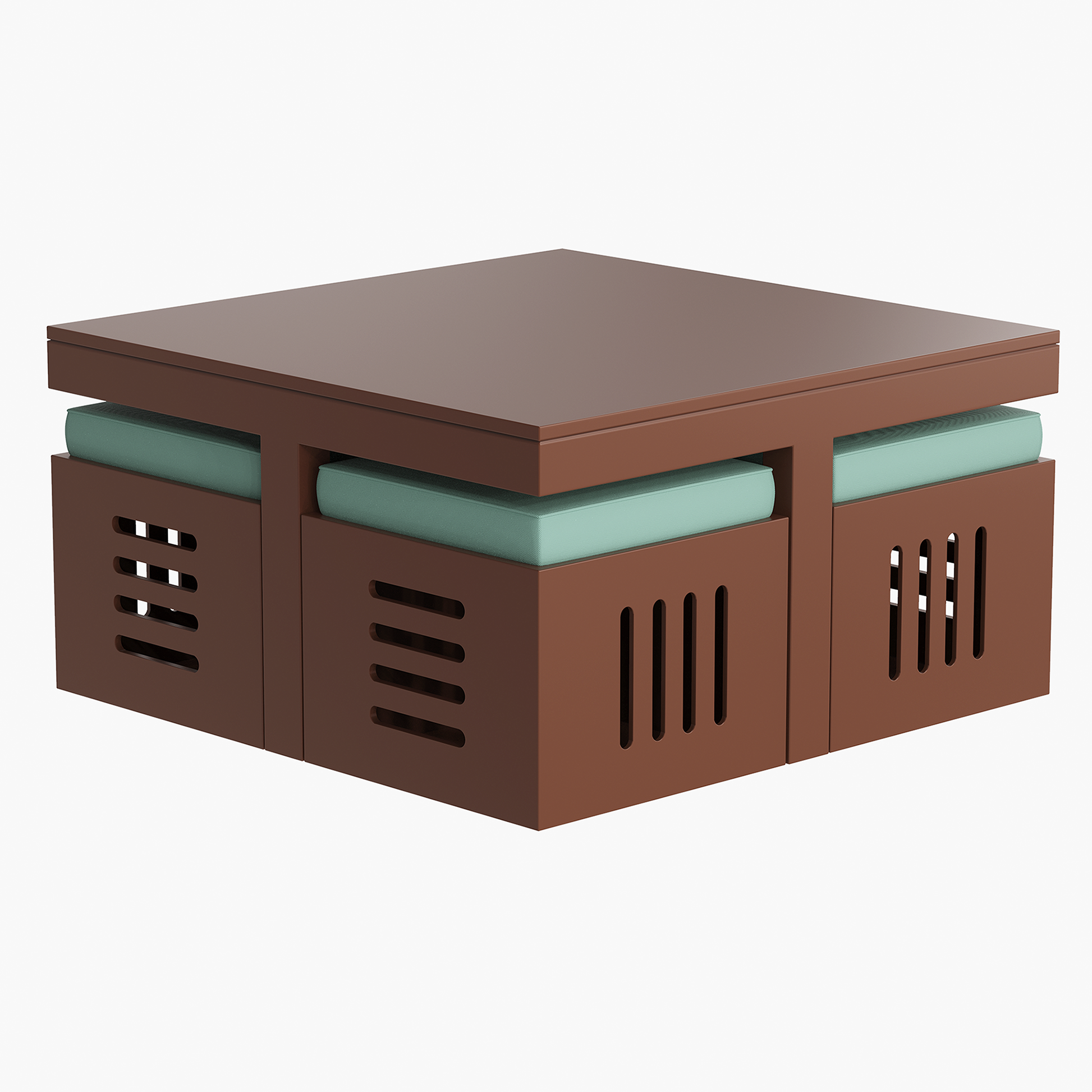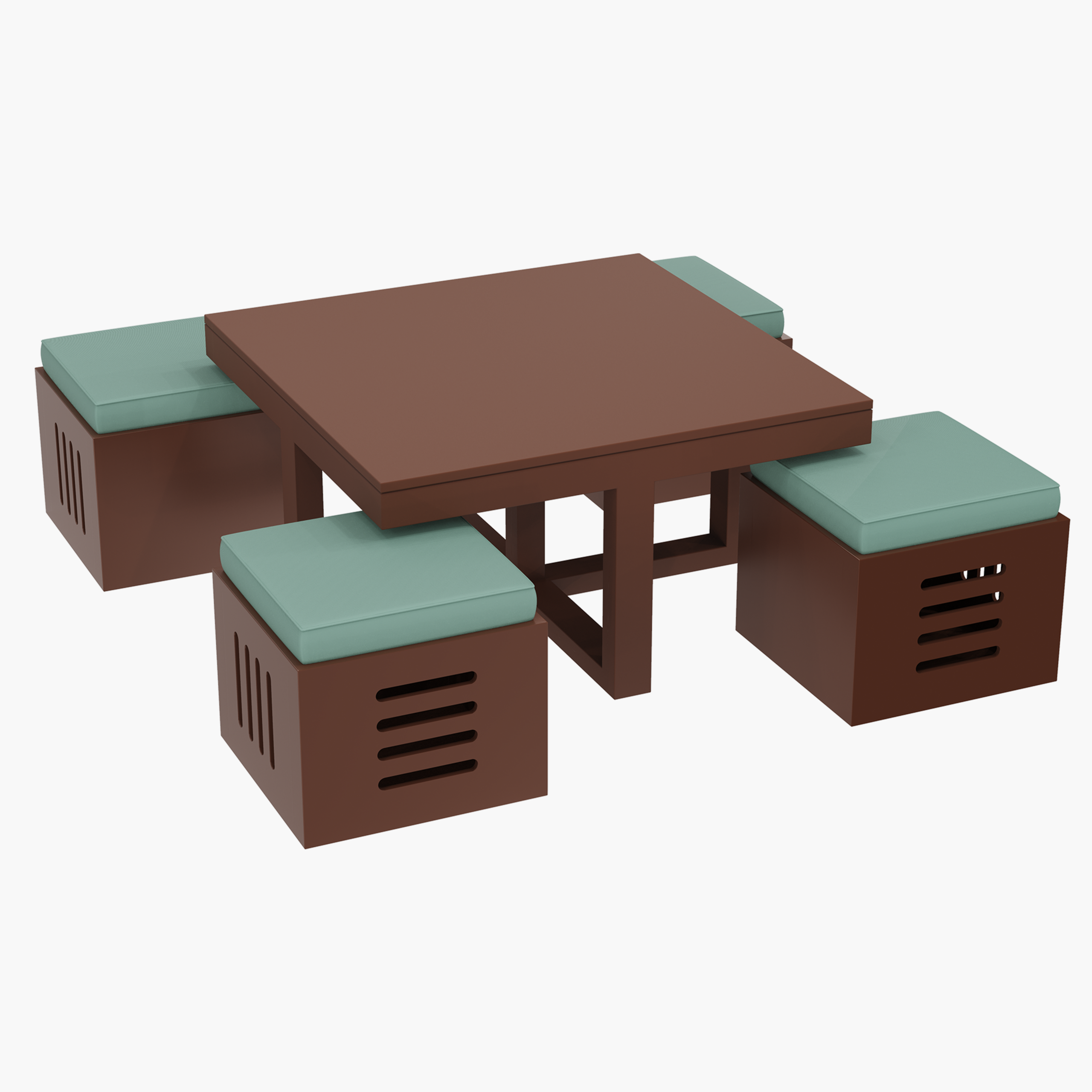 • Features a compact coffee table with matching stools that fit neatly underneath for space-saving use.
