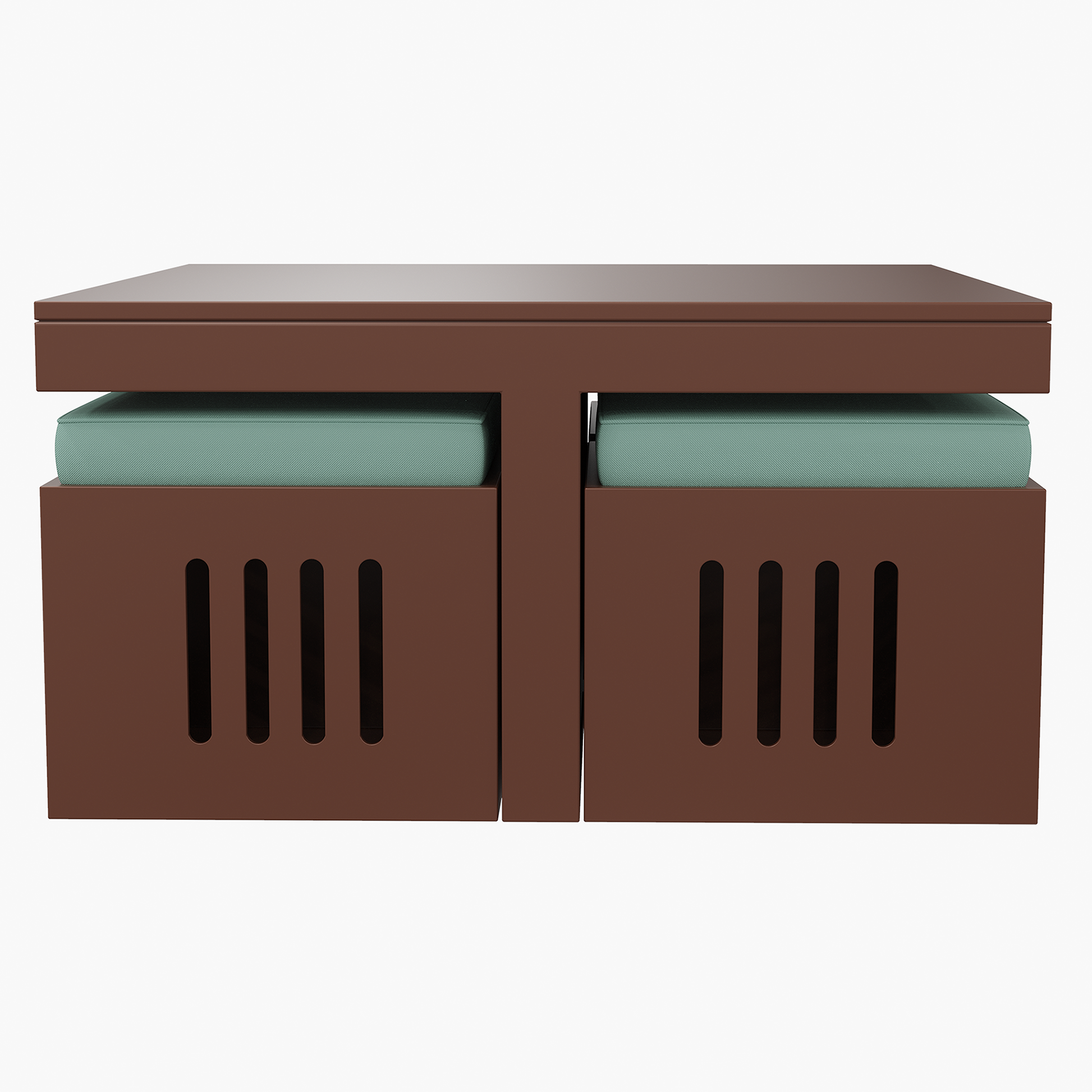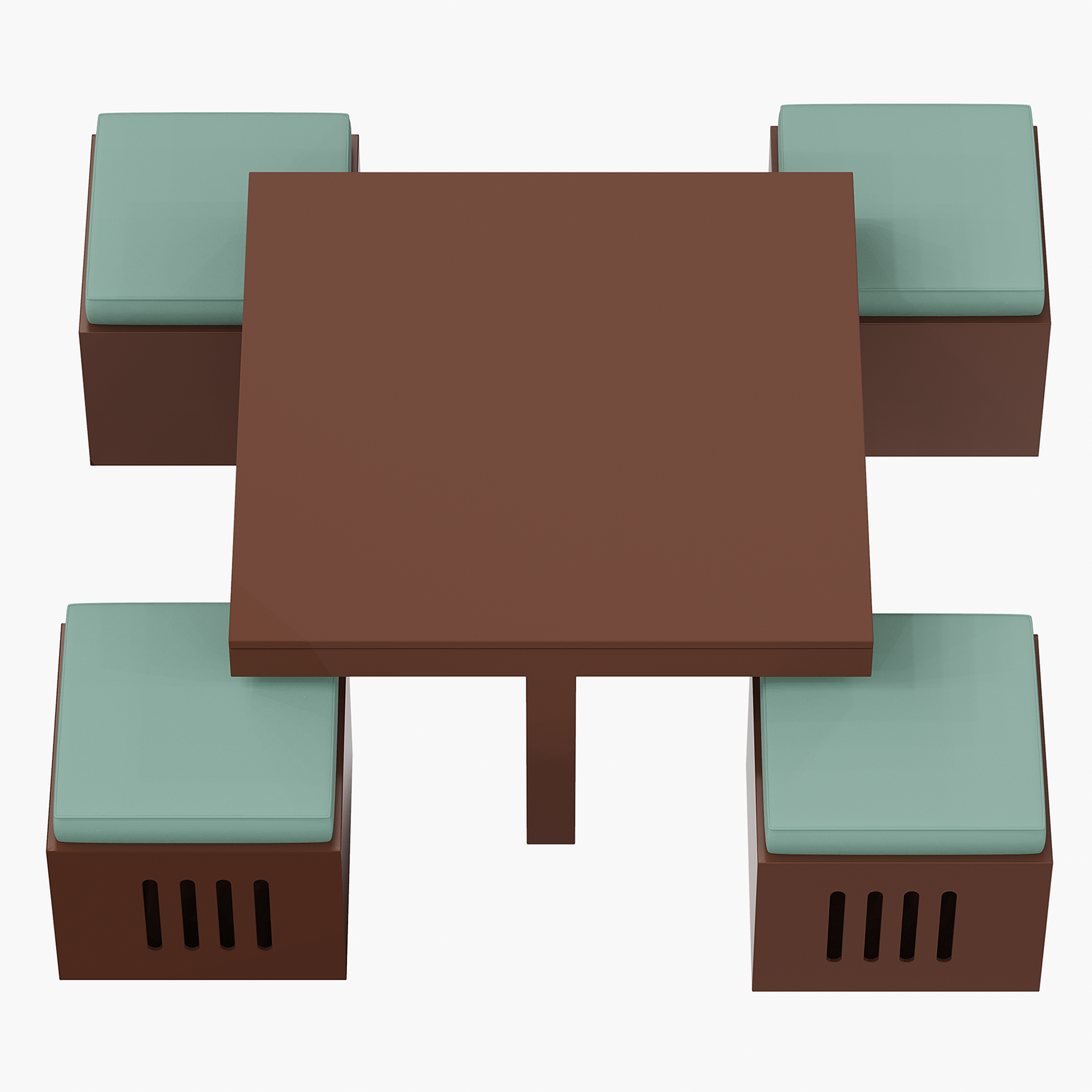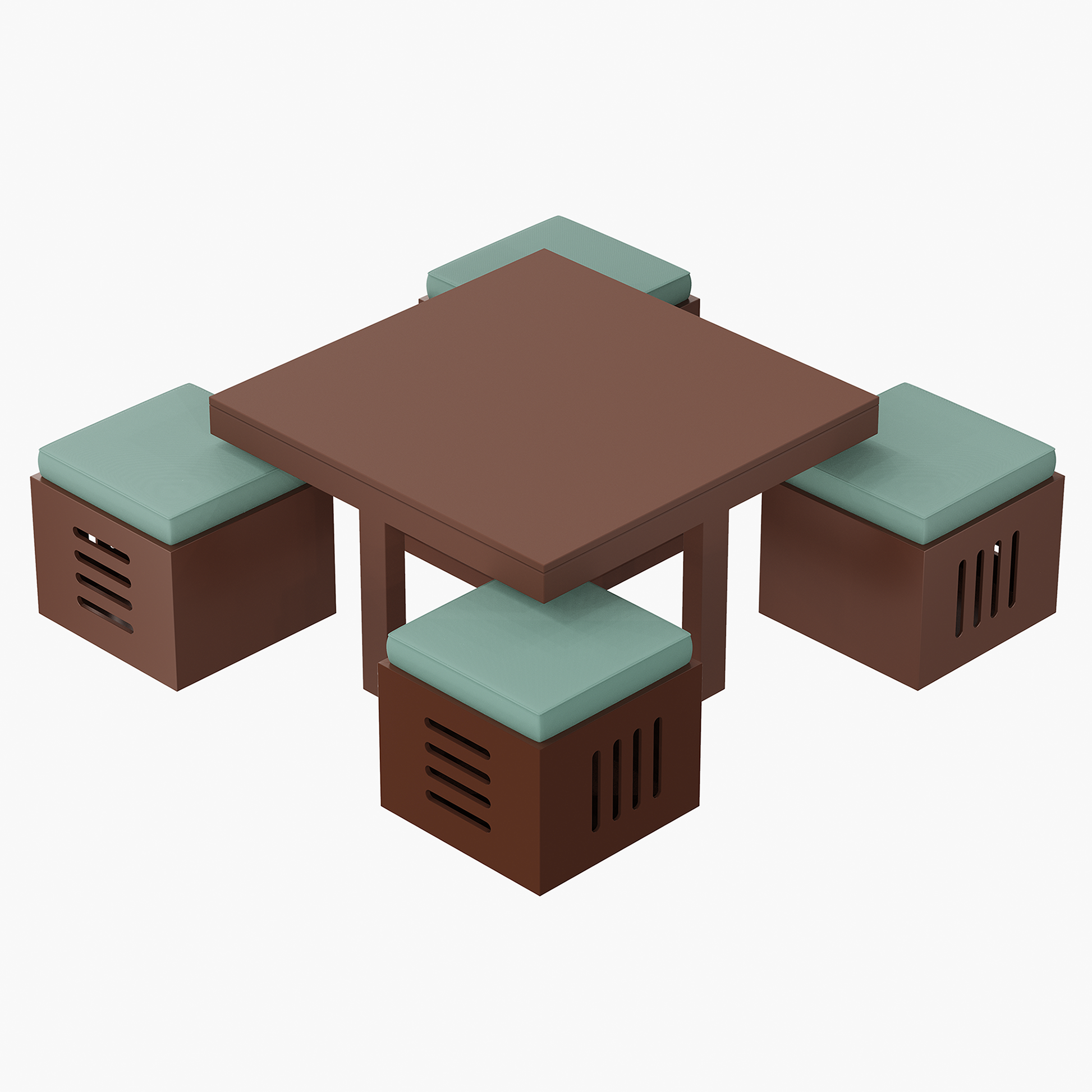 • Features a compact coffee table with matching stools that fit neatly underneath for space-saving use.